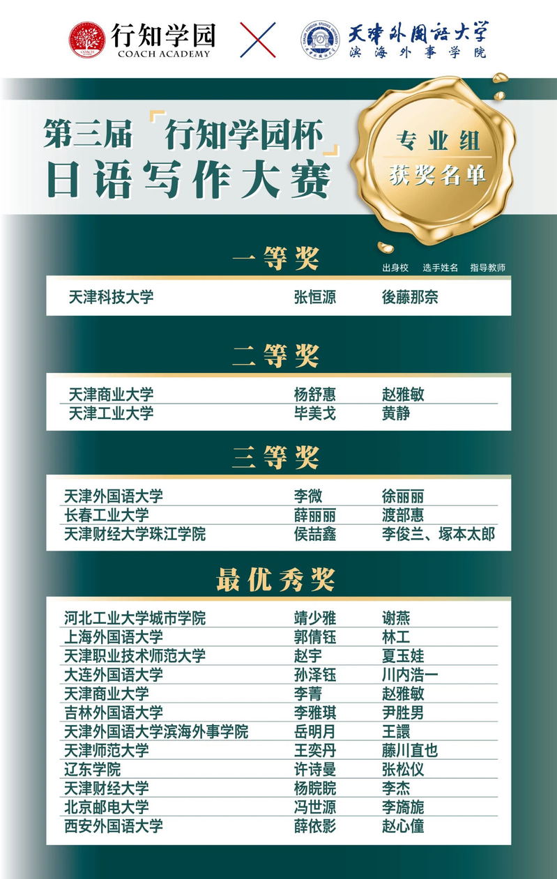 新闻网讯(通讯员 陈佳音)为加强中日两国的积极往来,促进中日文化交流与发展,为日语爱好者提供相互交流的平台,行知学园与行知学园天津校牵手天津外国语大学滨海外事学院日语系联合举办第三届“行知学园杯”日语写作大赛,10月22日,公布获奖名单,365英国官网日语专业18级薛丽丽、孙润昊同学在第三届“行知学园杯”日语写作大赛中获奖。