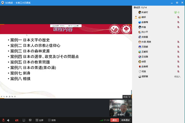 新闻网讯(通讯员 曾妍)按照学校、学院关于开展课程思政建设集中研讨活动的通知,为了进一步学习贯彻落实教育部印发的《高等学校课程思政建设指导纲要》,日语系制定了关于开展课程思政建设活动方案,并于10月9日晚7:30, 在线上QQ工作群平台,召开了“课程思政优秀案例观摩交流会”,日语系主任曾妍主持会议,日语系全体教师参加,副院长周爽观摩了交流会。
